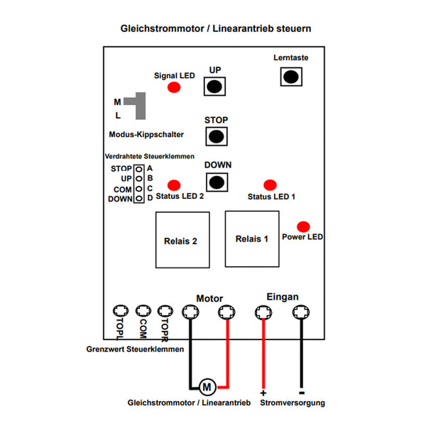 Limit-Steuerklemmen TOPR, COM und TOPL sind normalerweise geschlossen. Sie können Endschalter oder Sensoren (normalerweise geschlossen) an TOPR, COM und TOPL anschließen um den linearmotor steuerung.