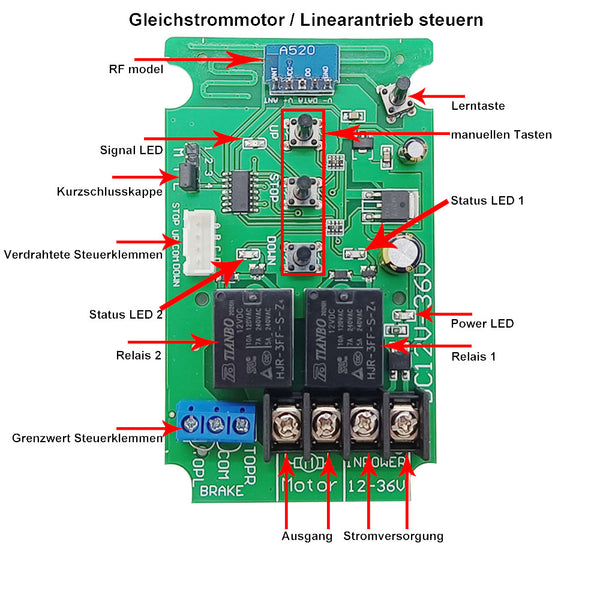 Wenn der Linearantrieb ausfährt, Die beiden Klemmen "TOPR" und "COM" sind nicht verbunden, um das stoppen Ausfahren des linearantrieb zu bewirken.