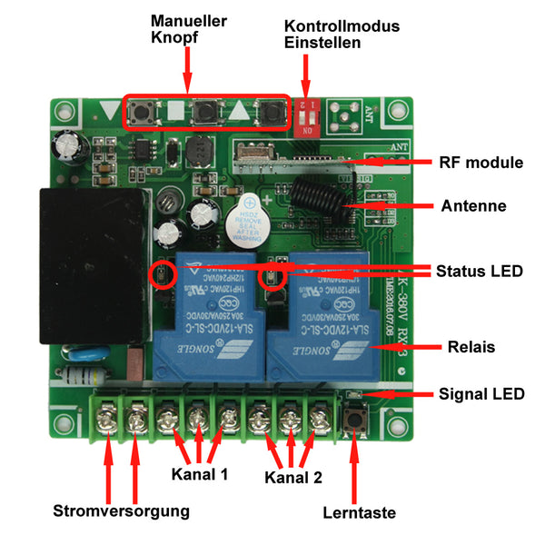 Relaisausgang: Der Empfänger ist Relaisausgang. Es können zur Steuerung DC und AC Geräte verwendet werden. Die Klemmen sind NO / NC (normalweise geöffnet / normalweise geschloßen) und es ist wie ein Funkschalter. Es bedeutet, dass Sie auch eine separate Stromversorgung an Geräte anschließen sollen.