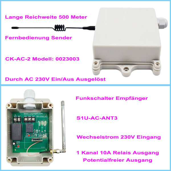 Wenn an sein Eingangskabel des Sender CK-AC-2 eine Wechselspannung angelegt wird, der Sender sendet automatisch ein Funksignal <ON>. Wenn der Empfänger dieses Funksignal empfängt, das Relais im Empfänger ist aktivier, und die angeschlossene Geräte funktionieren.