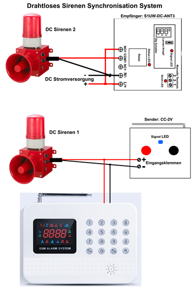Wenn die DC Sirene wird eingeschaltet, der Sender sendet automatisch ein Funksignal "ON". Wenn der Empfänger dieses Funksignal empfängt, schaltet er eine weitere DC Sirene ein.