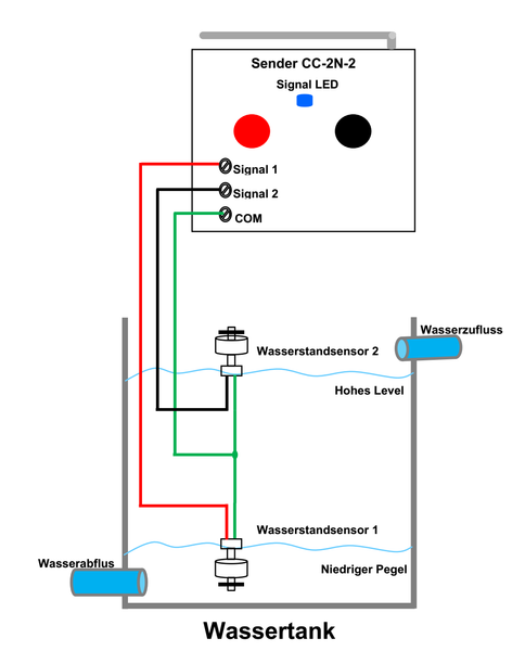 Mit diesem Sender und Empfänger können Sie die AC oder DC Geräte über den normalerweise offenen Kontakt eines anderen Geräts fernsteuern. Wie automatische Steuerung der Wasserpumpe für den Tank (siehe beigefügte Abbildung). Sie können zwei Wasserstandsensoren an diesen Sender anschließen und die Wasserpumpe an den Empfänger anschließen. Die Pumpe arbeitet dann automatisch entsprechend dem Wasserstand.