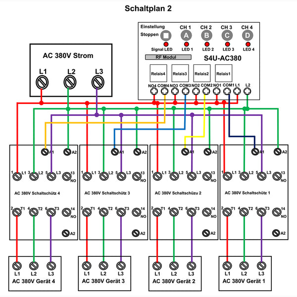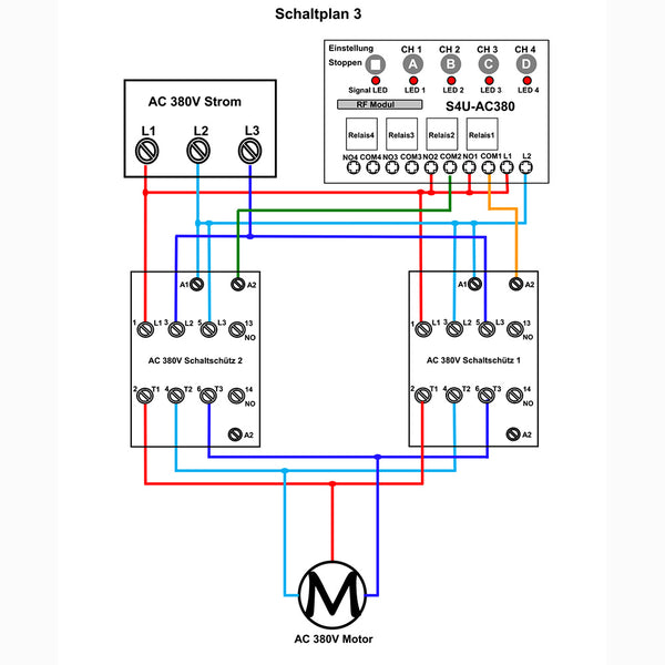 Hinweis: Dieser Modus eignet sich für die Vorwärts und Rückwärtsdrehung des 380V motor (siehe folgenden Schaltplan 3). Zwei Kanäle 1 und 2 können nicht gleichzeitig aktiviert werden.