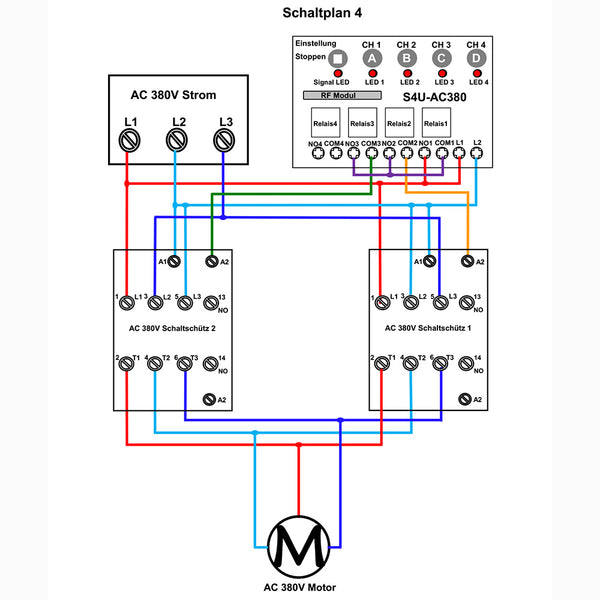 Hinweis: Dieser Modus eignet sich für die Vorwärts und Rückwärtsdrehung des 380V motor (siehe folgenden Schaltplan 4). Zwei Kanäle 2 und 3 können nicht gleichzeitig aktiviert werden.